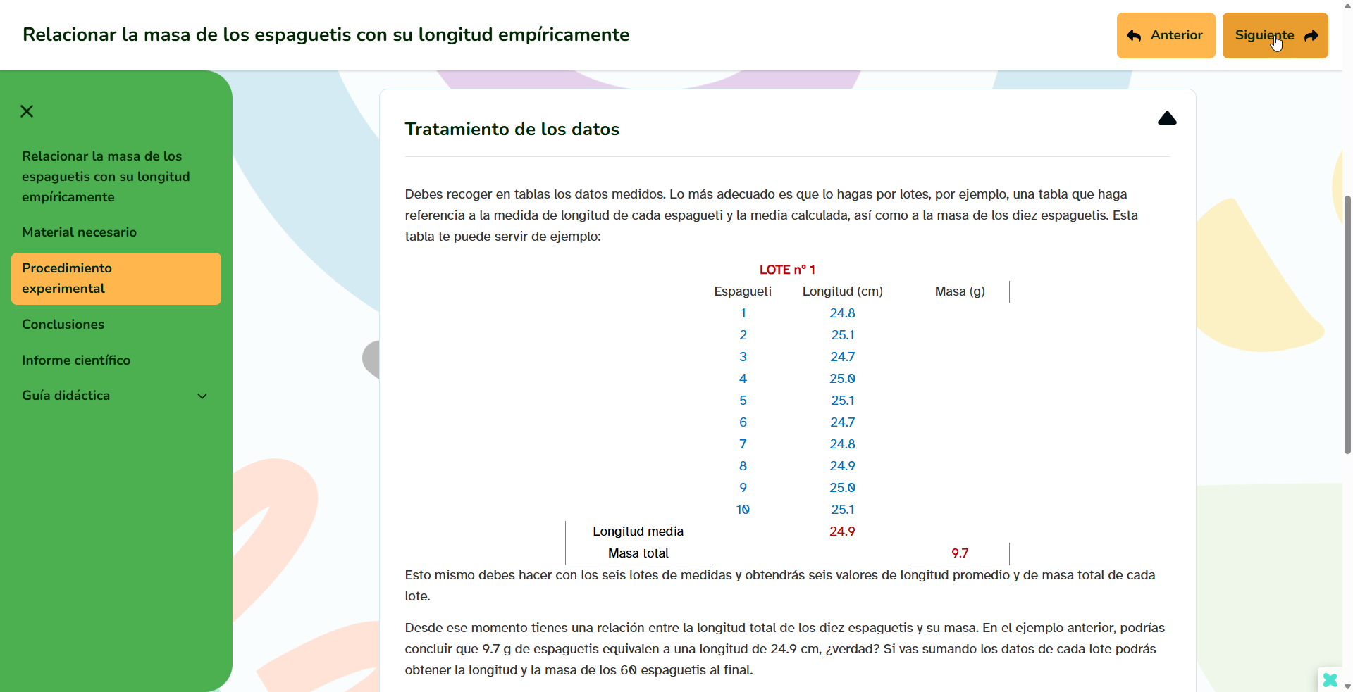 Durante el desarrollo de la situación de aprendizaje se va mostrando al alumnado el material necesario, cómo proceder experimentalmente, cómo tomar y ordenar los datos y cómo ha de tratarlos.