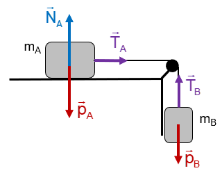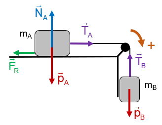Un bloque A de 3 kg de masa está sobre un plano horizontal y unido, mediante una cuerda inextensible y de masa despreciable, a un bloque B de 2 kg de masa que cuelga. Si el coeficiente de rozamiento entre el plano horizontal y el bloque A es 0.15:
