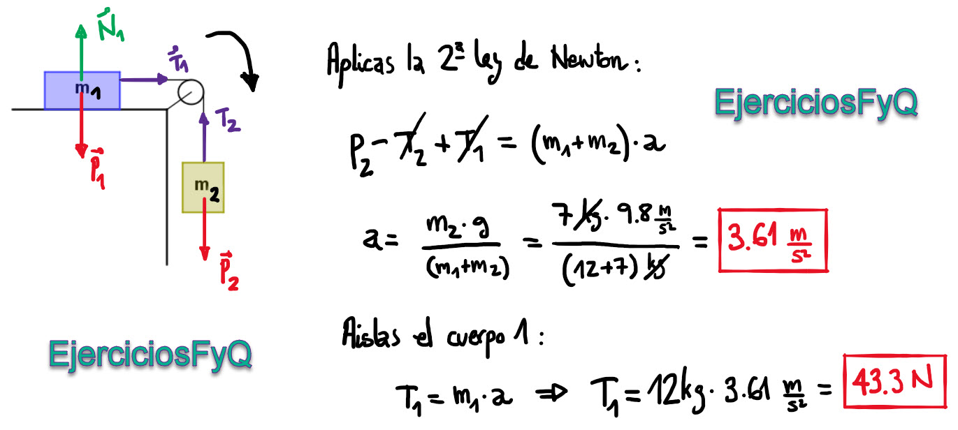 . Dibuja todas las fuerzas presentes en el sistema y calcula la aceleración con la que se mueve y la tensión de la cuerda