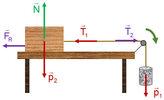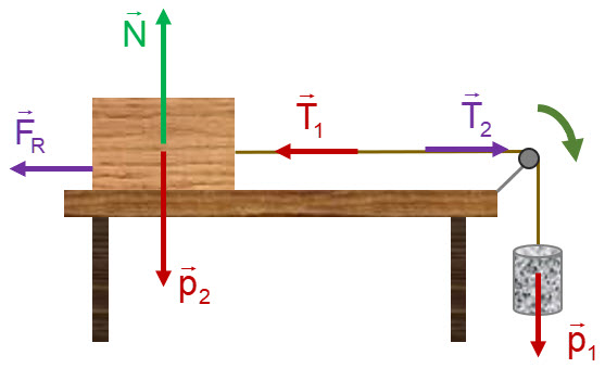 En una mesa hay un taco de madera de 500 g unido, mediante un hilo que pasa por una polea de masa despreciable, a una pesa de 250 g que cuelga. Si el coeficiente de rozamiento entre el taco y la mesa es 0.25, calcula: