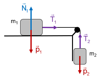 , que cuelga libre verticalmente. Aplica la segunda ley de Newton para encontrar las fórmulas para la aceleración del sistema y para la tensión de la cuerda y calcula el valor de cada una de ellas. Ignora la fricción y las masas de la polea y la cuerda.
