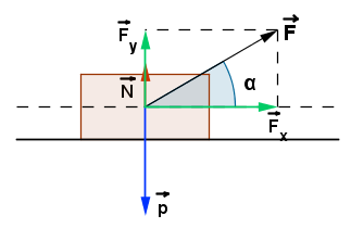 Sobre un cuerpo de 250 g, que está en reposo apoyado sobre una superficie horizontal y en ausencia de rozamiento, se aplica una fuerza de 2 N hacia la derecha que forma un ángulo de