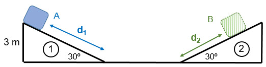 Un cuerpo se suelta desde el punto A, que se encuentra a una altura de 3 m, y recorre los dos planos inclinados que tienen un ángulo de