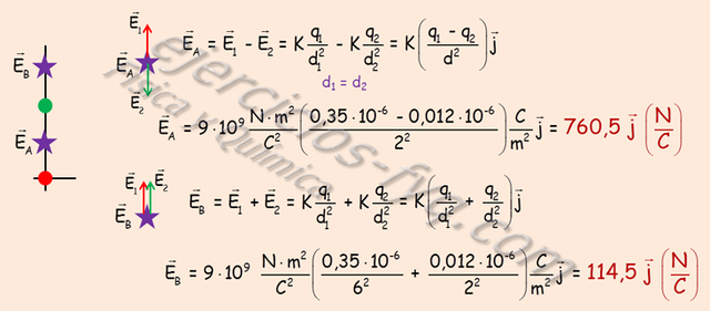 está en el punto (0,4). Determina el campo eléctrico resultante en los puntos (0, 2) y (0, 6). Las coordenadas están expresadas en metros.