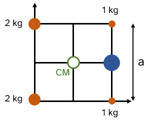 Si en medio de la recta que une las masas de 1 kg se sitúa una masa de M kilogramos resulta que el centro de masas del sistema formado está en el centro de dicho cuadrado. ¿Cuál debe ser el valor de la masa M?