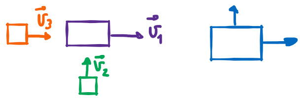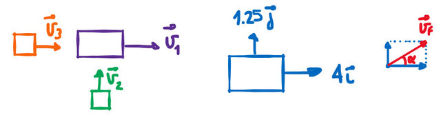 . Los tres vehículos quedan unidos y se desplazan como un solo cuerpo tras la colisión. ¿Cuáles son su velocidad y dirección justo después de la colisión?