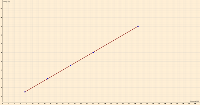 María y Ángela han construido un circuito conectando una fuente de alimentación, una resistencia y un voltímetro. Han realizado mediciones para distintos valores de potencial y han obtenido la siguiente tabla: