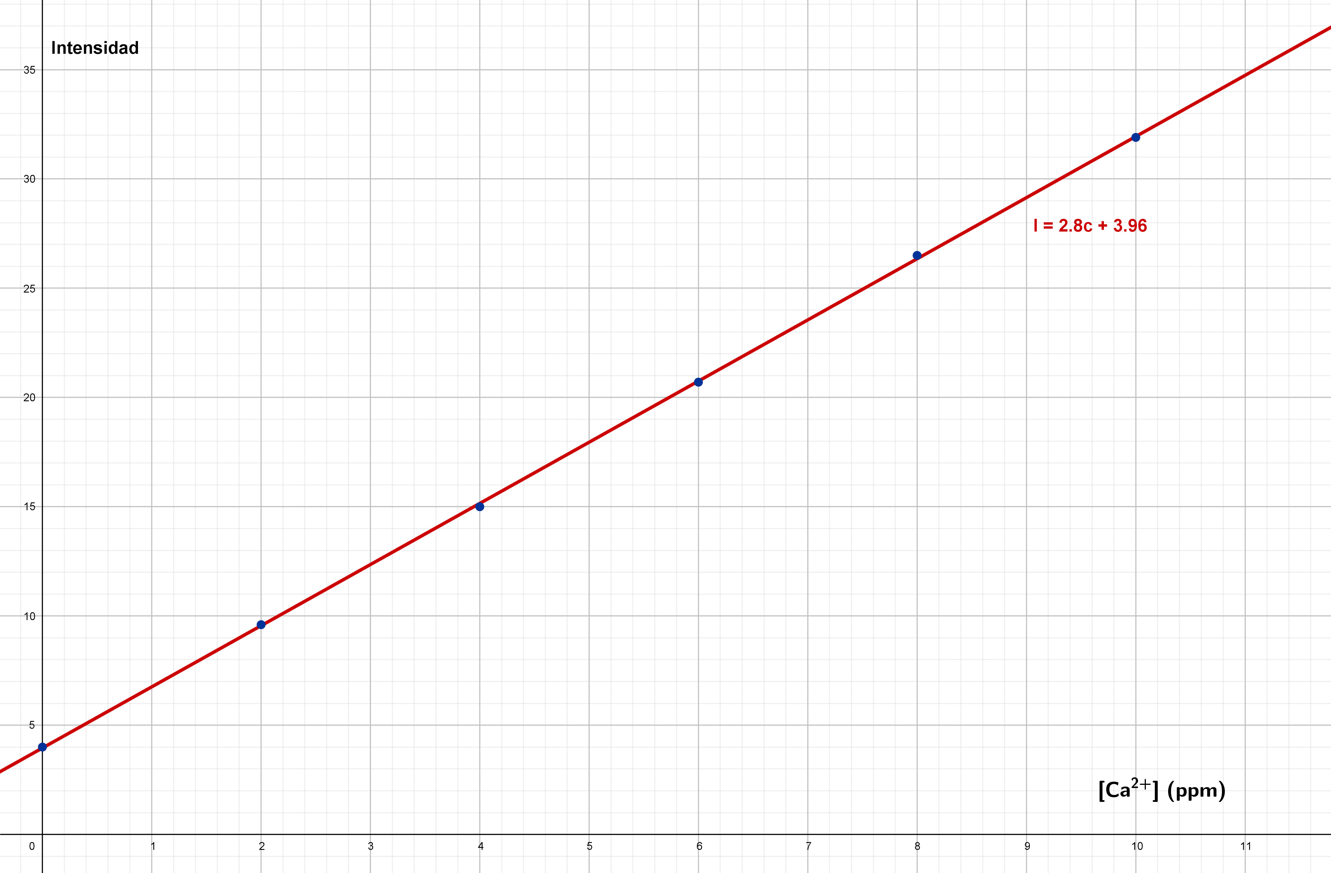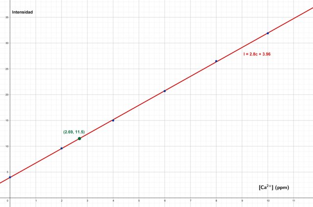 El dato de intensidad medido para una muestra de concentración desconocida fue 11.5. ¿Cuál es la concentración de catión en la muestra?