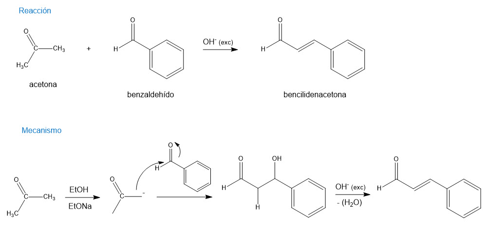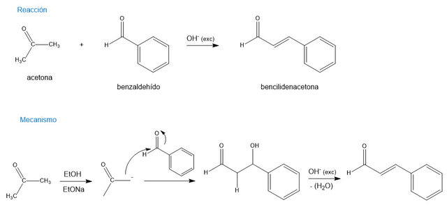 Indica el mecanismo de reacción que ocurre entre el benzaldehído y la acetona y nombra el producto obtenido.