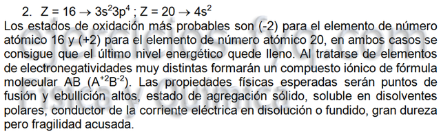 Escribe la configuración electrónica externa de los elementos Z = 16 (A) y Z = 20 (B), deduce cuáles será sus estados de oxidación más probables, el tipo de compuesto que formarán entre sí, la fórmula empírica y las propiedades físicas esperadas.