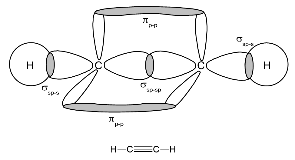 Representa la molécula de acetileno (etino) según el modelo de hibridación de orbitales atómicos e indica el tipo de enlaces que se establece entre los distintos átomos.