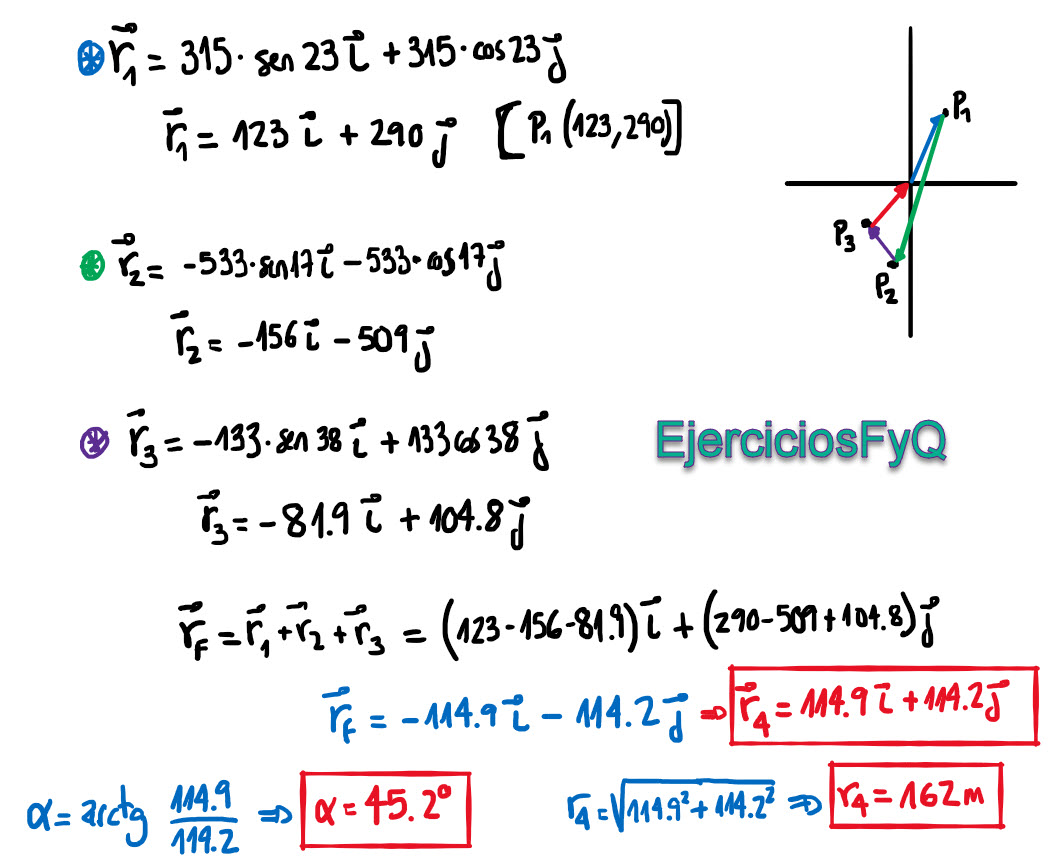 al oeste del norte. Tras un cuarto desplazamiento no medido, vuelve al punto inicial. Determina el vector, desplazamiento y dirección del cuarto desplazamiento.
