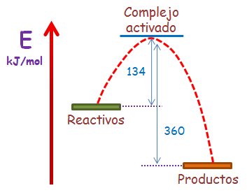 a) Dibuja el diagrama de entalpía teniendo en cuenta que las energías de activación para la reacción directa e inversa son 134 kJ/mol y 360 kJ/mol.