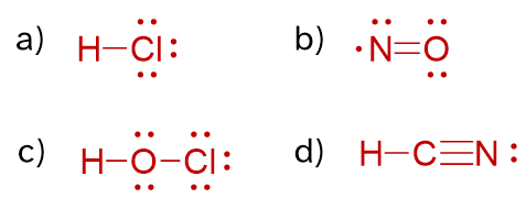 Diagramas de Lewis en moléculas covalentes (411) Domingo 14 de febrero de 2010, por F_y_Q | 2 | Covalente Lewis RESUELTO Representa los diagramas de Lewis de las siguientes moléculas: a) HCl b) NO c) HOCl d) HCN