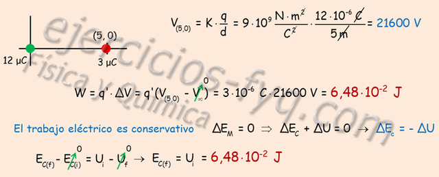 C desde el infinito hasta el punto (5, 0)? Si, partiendo del reposo, dejamos libre esta segunda carga, ¿cuál será su energía cinética cuando esté a gran distancia del origen? Las coordenadas están en metros.