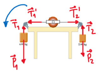 . Los tres objetos se unen mediante una cuerda que pasa sin deslizarse por las poleas, cuyos ejes carecen de fricción, y se unen al disco por medio de un eje central que le permite rodar libremente sobre una mesa con superficie rugosa. Si el sistema se libera a partir del reposo, halla lo siguiente: