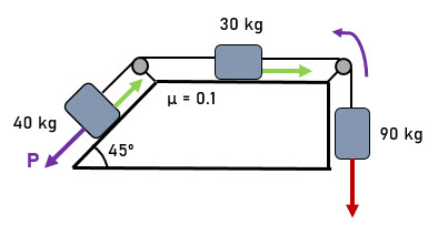 . Las poleas no tienen rozamiento y el coeficiente de rozamiento entre los bloques y el plano es 0.10. ¿Qué valor constante de P le dará una velocidad hacia arriba de