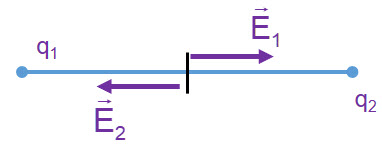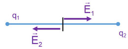 b) El campo eléctrico en el punto medio del segmento que une las dos cargas.