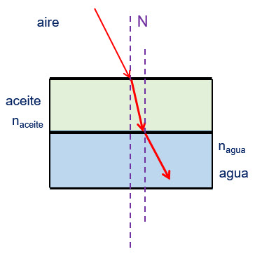 Es importante señalar que hay que ilustrar bien los cambios de dirección del rayo cuando pasa de un medio a otro. Como el índice de refracción del aceite es mayor que el del aire, el rayo se acerca a la normal. Cuando pasa del aceite al agua, al ser menor el índice de refracción del agua que el del aceite, el rayo se aleja de la normal.