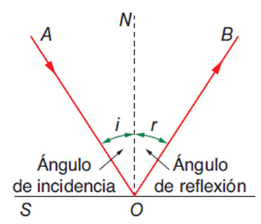 donde A y B son los rayos incidente y N es una línea perpendicular a la superficie de reflexión llamada normal y que sirve de referencia para definir los ángulos de incidencia y reflexión. La primera ley de Snell, para la reflexión, dice que los ángulos de incidencia y reflexión han de ser iguales: