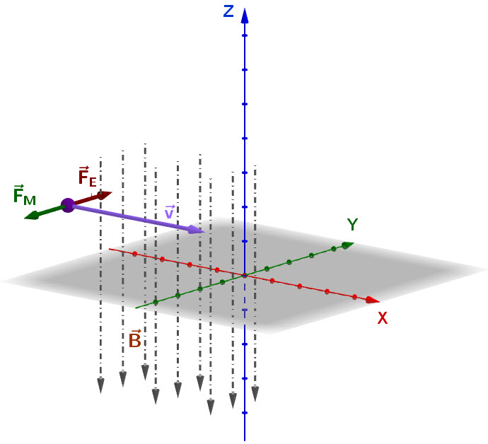 a) Un electrón se mueve en sentido positivo del eje OX en una región en la que existe un campo magnético dirigido en el sentido negativo del eje OZ. i) Indica, de forma justificada y con ayuda de un esquema, la dirección y el sentido en que debe actuar un campo eléctrico uniforme para que la partícula no se desvíe. ii) ¿Qué relación deben cumplir para ello los módulos de ambos campos?