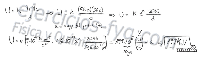 En la fisión nuclear del uranio-235 un núcleo de esa especia captura un neutrón y se divide en dos núcleos más ligeros; uno de bario-56 y otro de kriptón-36. Suponiendo a ambos núcleos como cargas puntuales positivas y que están separadas por una distancia de