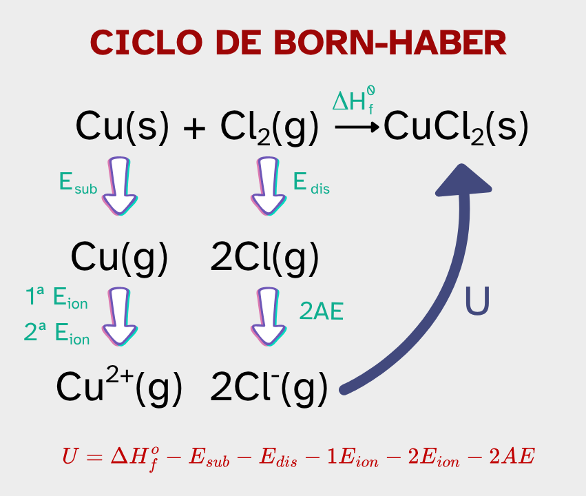 Diseña el ciclo de Born-Haber para calcular la energía reticular del $$$ \text{CuCl}_2$$$ a partir del cobre metálico y del cloro gaseoso. Indica todas las magnitudes que serían necesarias para hacer el cálculo y la ecuación final que resulta.