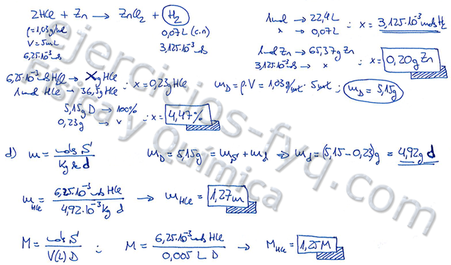 Se dispone de una disolución acuosa de HCl, cuya densidad es de 1,03 g/mL. Se toman 5 mL de esta disolución a los que se les va añadiendo cinc en polvo hasta que se observa que cesa el desprendimiento de gas, momento en el que se para la reacción y se mide que se han desprendido 70 mL de gas, medidos en c.n.