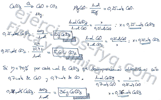 a) Se han obtenido 14 g de CaO por descomposición térmica del carbonato de calcio. ¿Qué cantidad de éste habrá reaccionado? ¿Qué volumen ocupa el