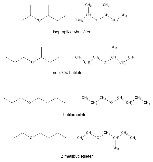 Escribe las estructuras en esqueleto y semidesarrolladas del propilsec-butiléter y de tres isómeros de cadena, nombrándolos según las normas de la IUPAC.