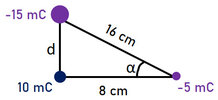 En el vértice inferior de la hipotenusa de un triángulo rectángulo se ubica una carga de -5 mC y en el vértice del ángulo recto otra carga de 10 mC. La longitud de la hipotenusa es 16 cm y la base 8 cm. Calcula la fuerza resultante sobre una carga de -15 mC ubicada en el otro vértice.