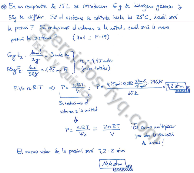 , ¿cuál será la presión? Si reducimos el volumen a la mitad, ¿cuál sería la nueva presión del sistema? (H = 1 ; F = 19).