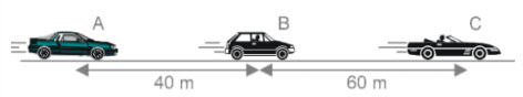 El esquema representa el instante inicial de la persecución entre tres vehículos A, B y C que viajan a velocidades de