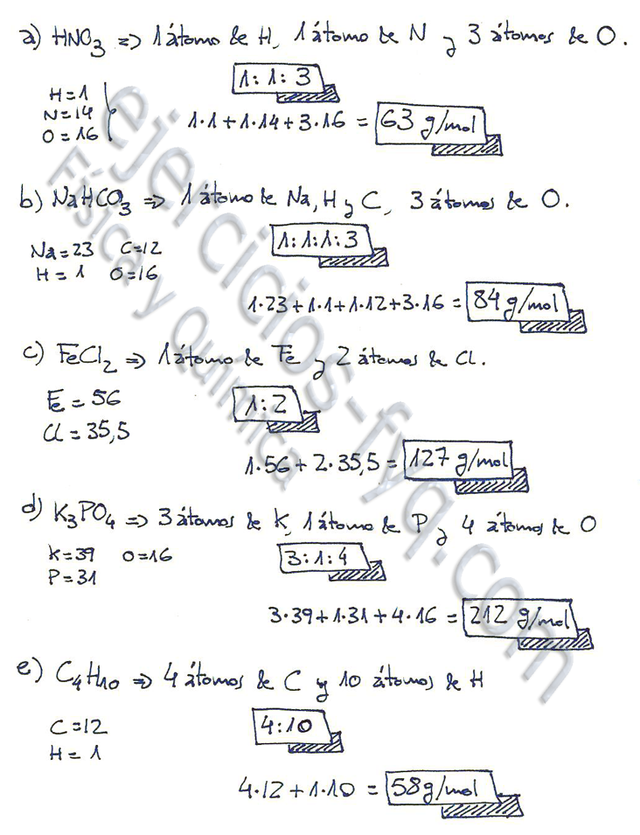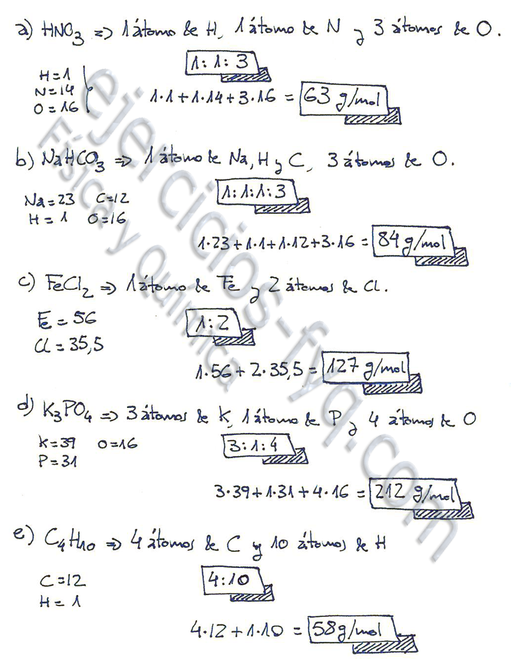 Interpreta las fórmulas de los siguientes compuestos indicando el número total de átomos de cada una, la proporción en la que está cada tipo de átomo y, con ayuda de una tabla periódica, la masa molecular de cada una: