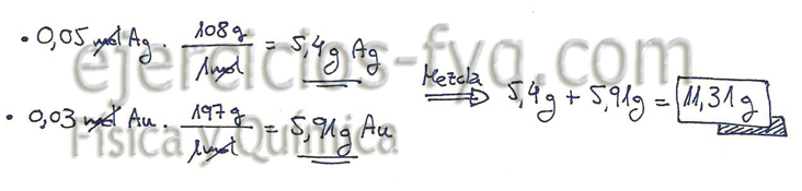 Un joyero funde y mezcla 0,05 moles de plata y 0,03 moles de oro. ¿Cuál es la masa total de la aleación?