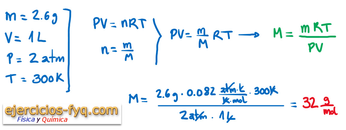 En un recipiente de 1 L, a 2 atm de presión y 300 K de temperatura, hay 2.6 g de un gas. ¿Cuál es la masa molecular del gas?
