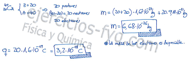Masa y carga del átomo de calcio a partir de sus números atómico y másico (342)