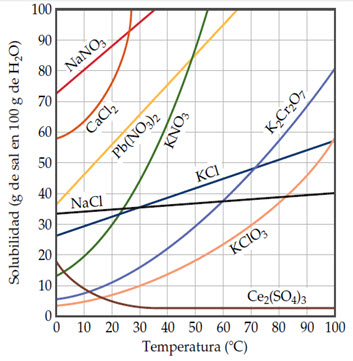 A partir de los datos del siguiente gráfico de solubilidades, y considerando que la densidad del agua es
