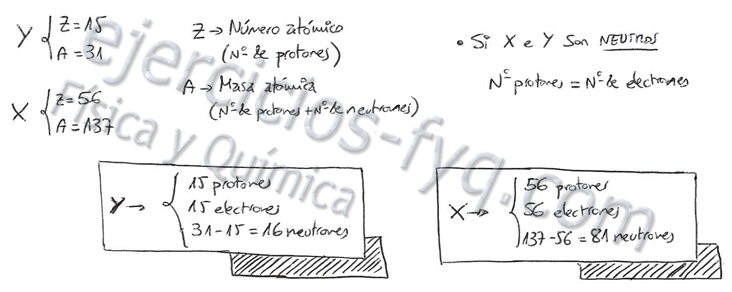 Determina el número de protones, neutrones y electrones que poseen los átomos Y (Z = 15 ; A = 31) y X (Z = 56 ; A = 137)