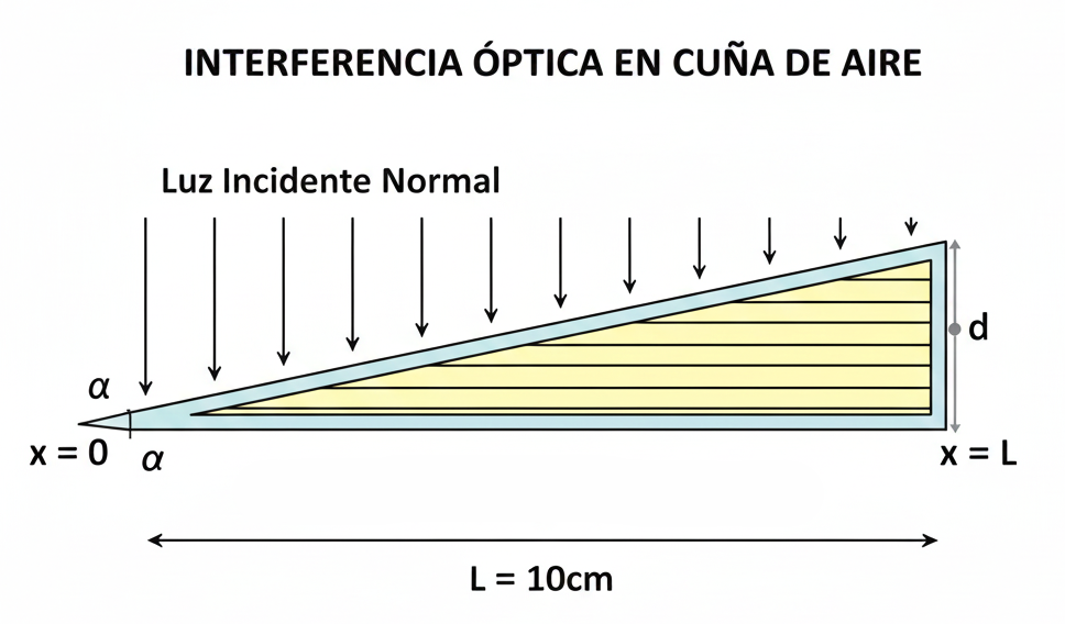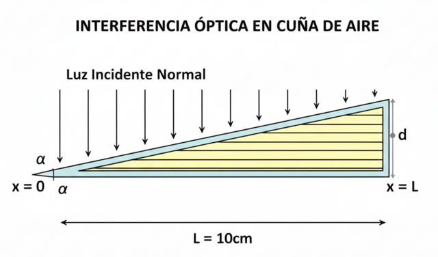 Se dispone de dos láminas planas de vidrio, cuyo índice de refracción es $$$ \text{n}_\text{v} = 1.5$$$, de longitud L = 10 cm. Una de ellas se apoya sobre la otra, pero en un extremo se separa mediante un alambre delgado de diámetro «d», formando una cuña de aire de ángulo muy pequeño «$$$ \alpha$$$», como se muestra en la figura: