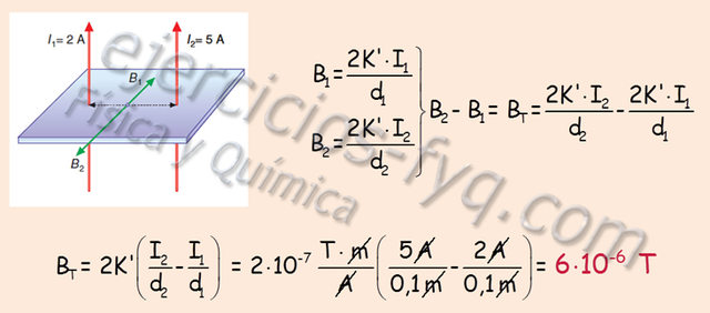 Por dos conductores rectilíneos, paralelos y de gran longitud circulan corrientes de 2 y 5 A en el mismo sentido. La distancia entre ellos es de 20 cm. Calcula el campo magnético creado por ellos en el punto medio de la recta que une normalmente los dos conductores.