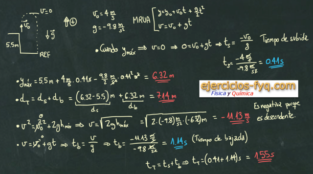 Desde una ventana de 5.5 m de altura se lanza hacia arriba una pelota de tenis con una velocidad de 4 m/s. Determina la altura máxima a la que llega la pelota de tenis, la velocidad con la que llega al suelo, el espacio que recorre y el tiempo que está en el aire.