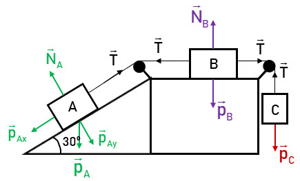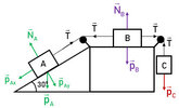 Si el coeficiente de rozamiento dinámico de los bloques A y B, con respecto a la superficie sobre la que deslizan, es 0.4, calcula el valor de la fuerza de la gravedad sobre el bloque C para que la aceleración del sistema sea de