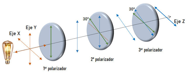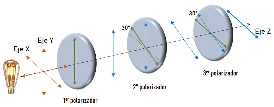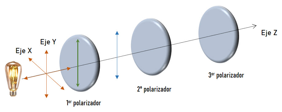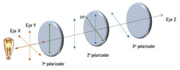 Tres filtros polarizadores tienen el mismo eje óptico en común a lo largo del eje Z. El primer filtro polarizador tiene su eje de polarización paralelo al eje Y. Para el segundo filtro, su eje de polarización forma un ángulo de