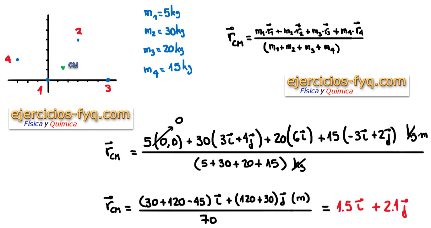 Encuentra el centro de masas del sistema formado por las siguientes partículas, dadas sus masas y sus coordenadas expresadas en metros: