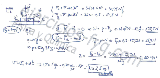 Calcula la velocidad que llevará el cuerpo de la figura a los 5 s de actuar la fuerza si su velocidad inicial es de 1 m/s.