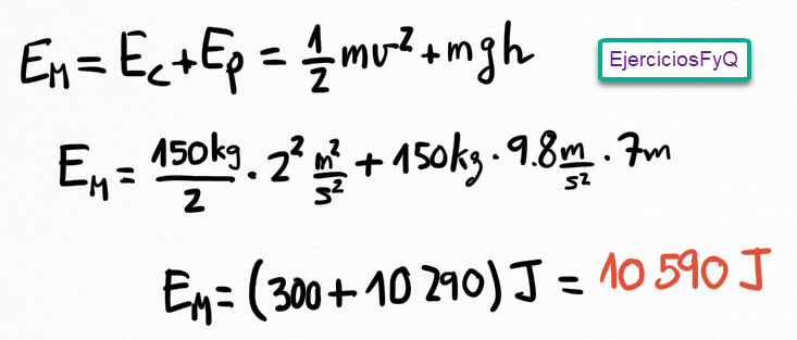 En un espectáculo circense un motorista circula por un cable a 2 m/s y una altura de 7 m, ¿qué energía tiene si la suma de su masa y la de la moto es de 150 kg?