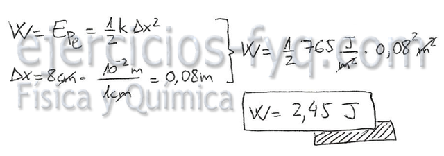 Problema energía 0004 5008 Lunes 15 de febrero de 2010, por F_y_Q | Energía potencial elástica Trabajo RESUELTO Sabiendo que la constante de recuperación de un muelle es , calcula el trabajo necesario para estirarlo 8 cm.