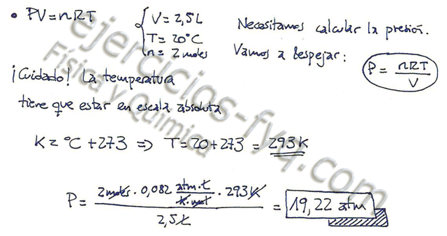 Problema moles 0008 Viernes 5 de marzo de 2010, por F_y_Q | Mol Gases RESUELTO Si encerramos dos moles de un gas en un recipiente de 2,5 L a 20 ºC, ¿qué presión soportará el recipiente? ()