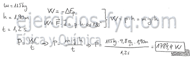 Calcula la potencia que desarrolla una levantador de pesos que es capaz de levantar 115 kg a una altura de 1,90 m en 1,2 s.